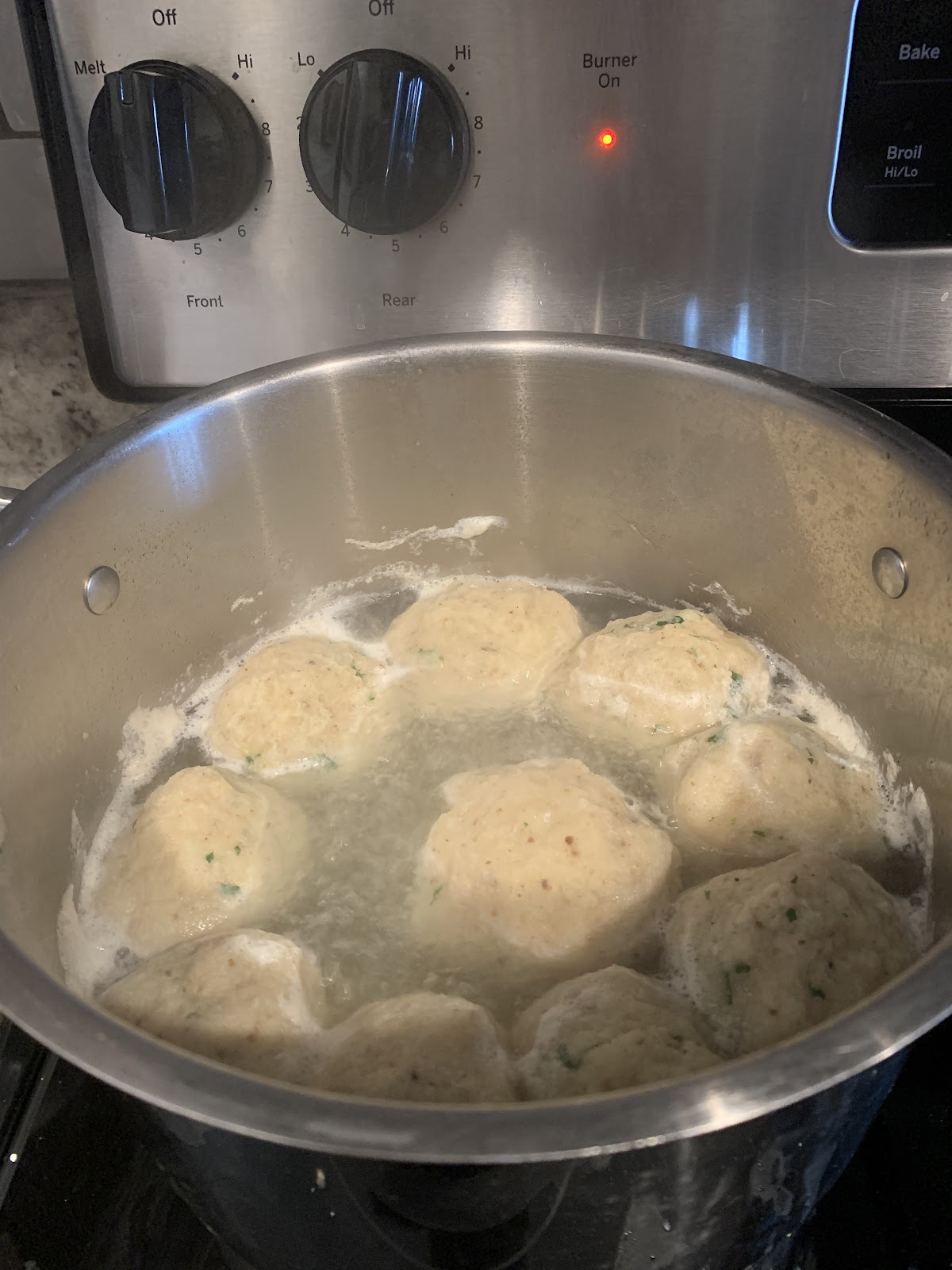 I took a poll once and decided that the only matzoh balls I’m going to make are floaters. Working on the recipe I Think I came up with the perfect one. I also tested if the batter needs to stay in the refrigerator for an hour before cooking. I found that it is absolutely necessary, because if you don’t you end up with them falling apart. You can see the difference between the two pots of matzoh balls.