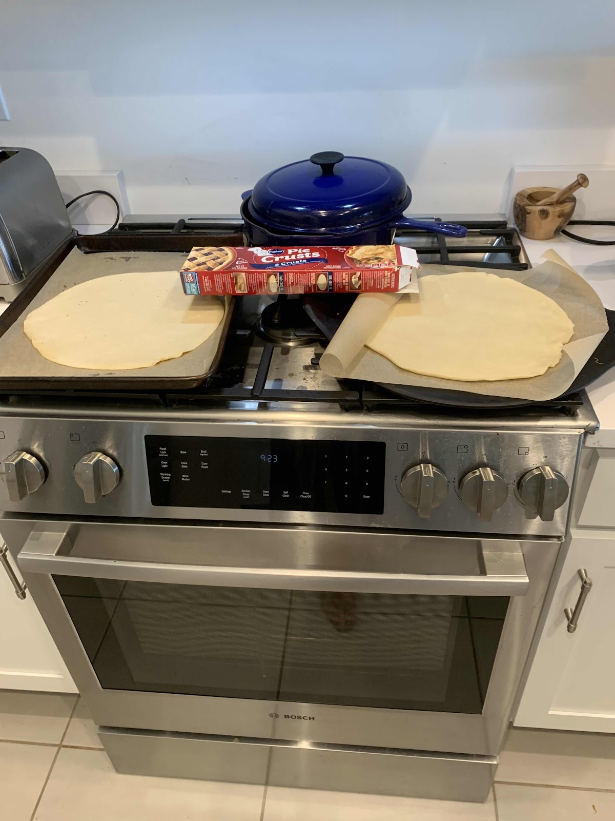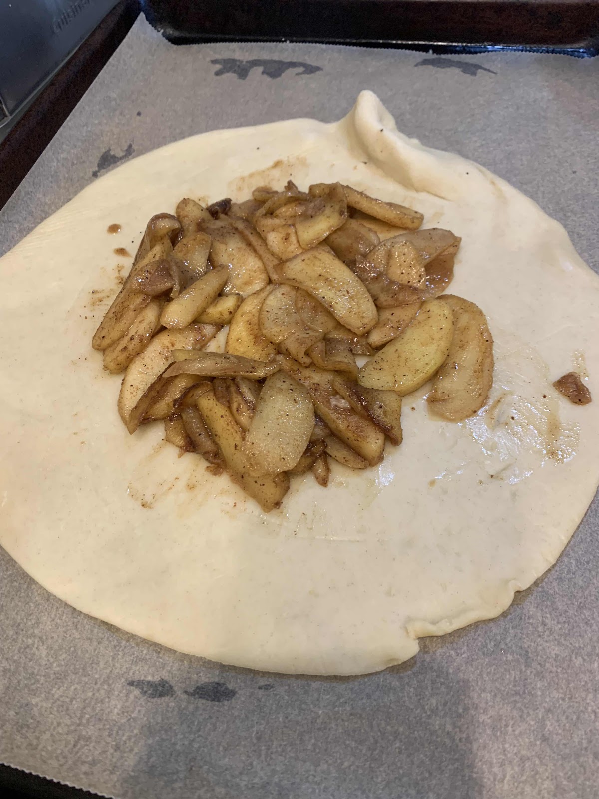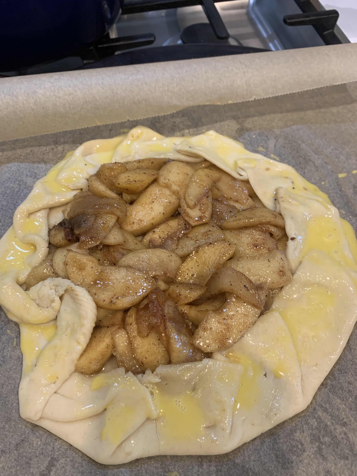 * Unroll the pie crusts onto parchment paper and place cooled fruit in an even layer in the3 centers of each pie crust. Leaving a 1 1/2 inch empty border around the edges. Using your fingers fold edges in pleats as you go. The look is rustic. Brush the edges with one beaten egg and 2TBSP water for a stunning glossy crust.